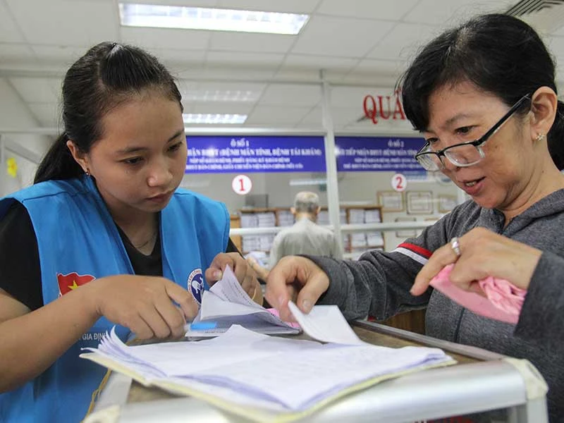 Tình nguyện viên hướng dẫn người bệnh làm thủ tục khám bằng bảo hiểm y tế ở Bệnh viện nhân dân Gia Định. Ảnh: HOÀNG GIANG