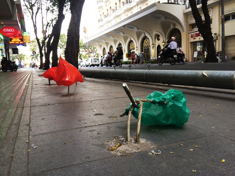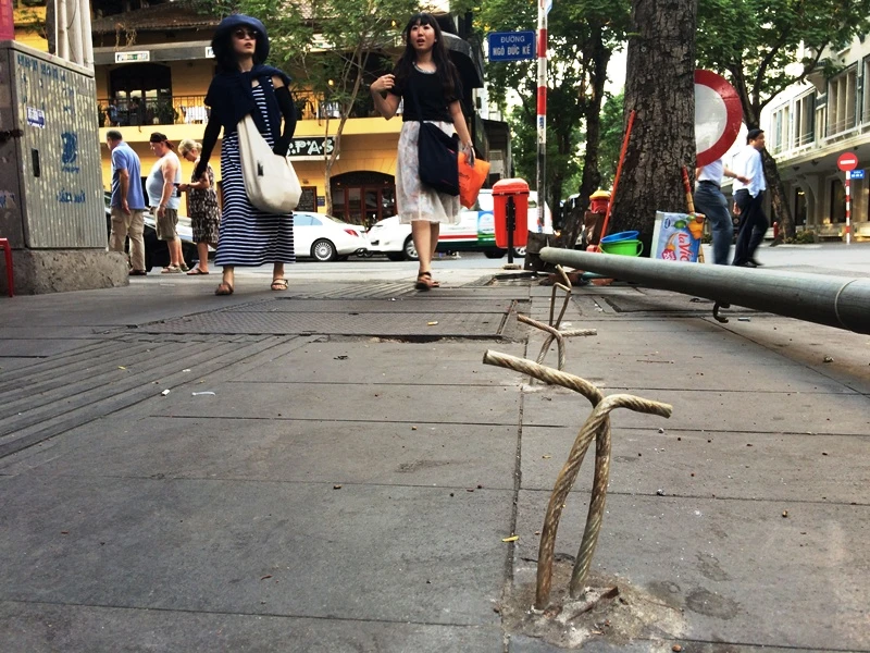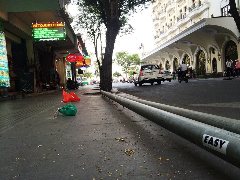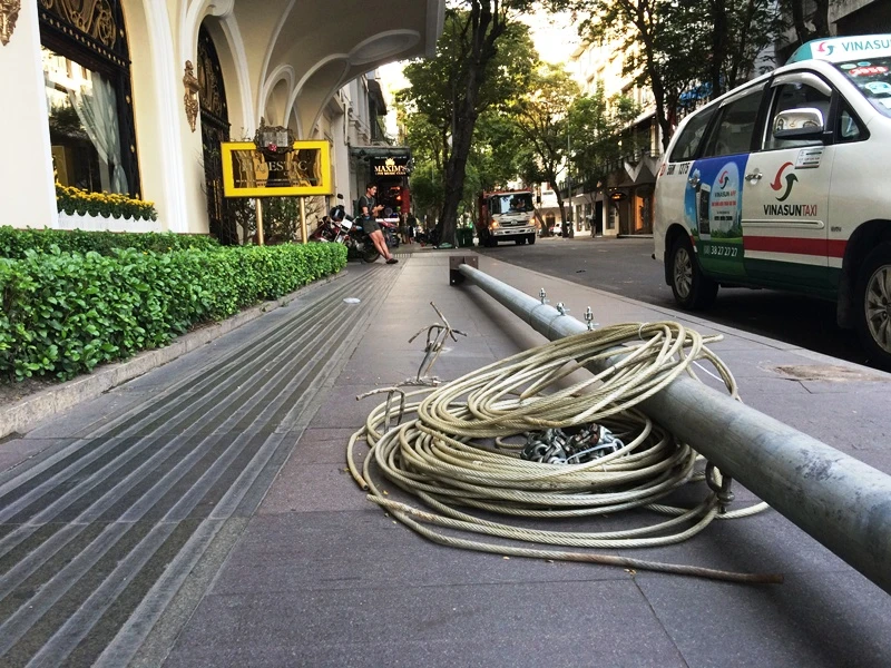 Không riêng chỉ có dây cáp mà những cột đèn chiếu sáng dù đã được tháo dỡ nhưng không được di chuyển đi nơi khác được đặt dọc vỉa hè gây khó khăn, nguy hiểm cho việc đi lại của người dân. Trong khi đó vỉa hè nhiều nơi rất hẹp nên việc vấp phải lõi cáp hoặc cột thép là điều không thể tránh khỏi.