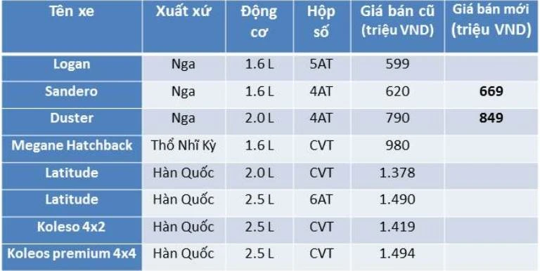 Trong đó, Duster và Sandero có hai mức giá mới là 669 triệu đồng và 849 triệu đồng.