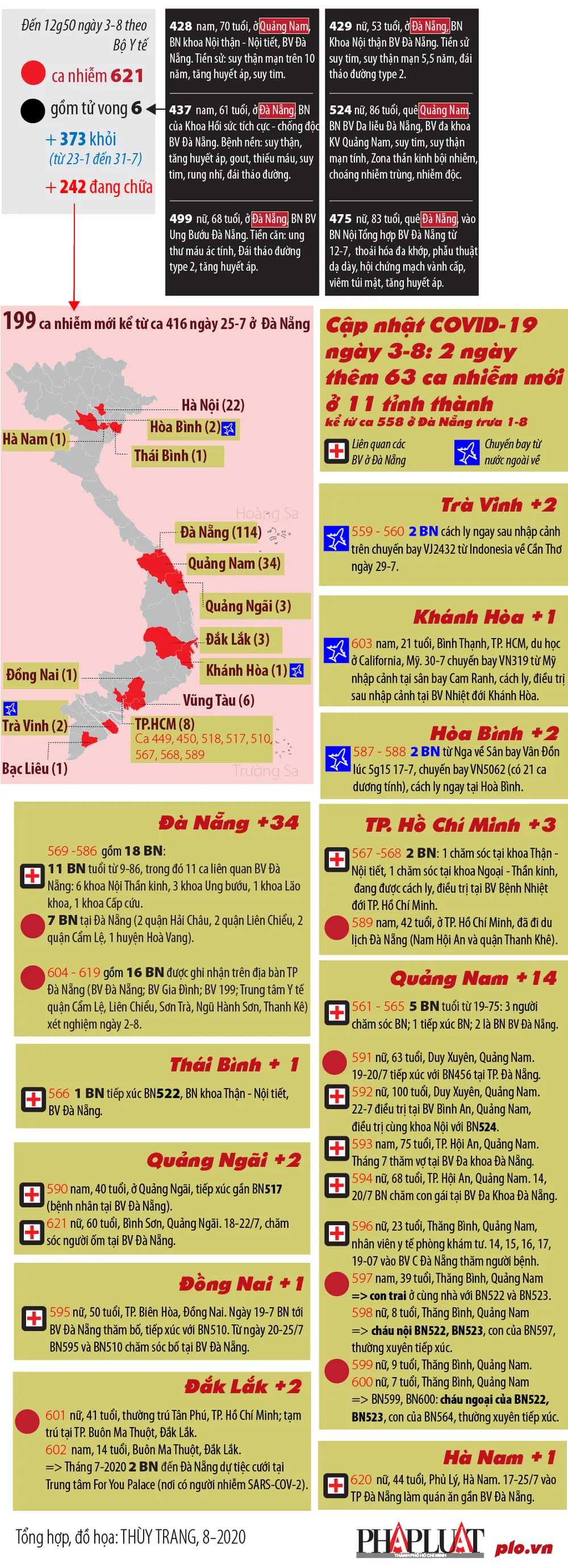 (PLO)- Hai ngày gần đây ghi nhận 63 ca nhiễm COVID-19 mới ở 11 tỉnh thành, 6 ca tử vong ở Quảng Nam, Đà Nẵng kể từ ca 558 ở Đà Nẵng trưa 1-8.