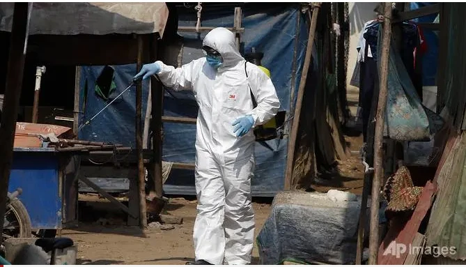 Một nhân viên phun thuốc khử trùng để giúp ngăn chặn sự lây lan của virus COVID-19 tại khu phố ổ chuột Stung Meanchey ở phía nam Phnom Penh, Campuchia. Ảnh: AP