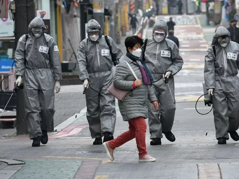 Lực lượng chức năng phun thuốc khử trùng ở một khu phố mua sắm ở thủ đô Seoul. Ảnh: AFP