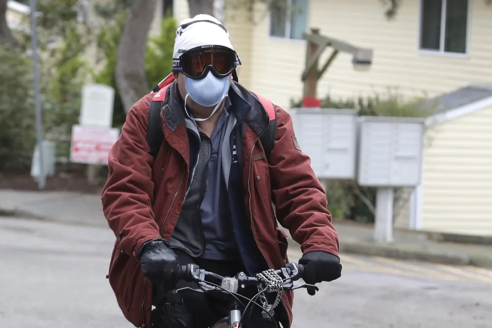 Người dân phải đeo khẩu trang và đồ bảo hộ khi đi ngang khu vực gần viện dưỡng lão. Ảnh: AP