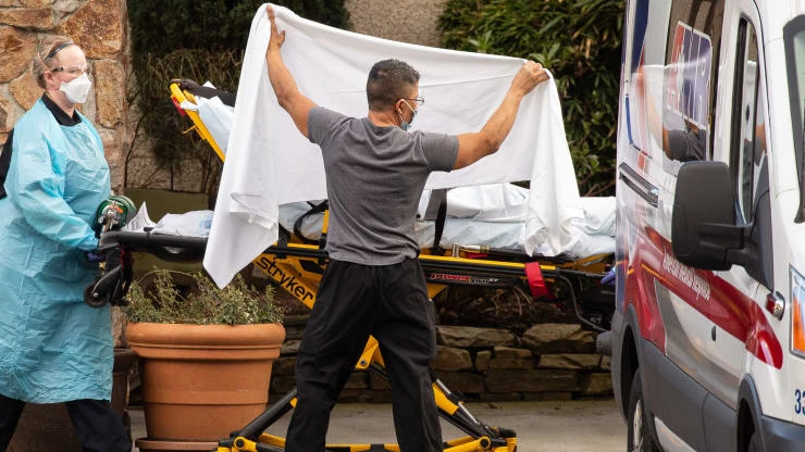 Các nhân viên y tế đang chuyển một bệnh nhân nhiễm COVID-19 tại viện dưỡng lão hôm 29-2. Ảnh: AP