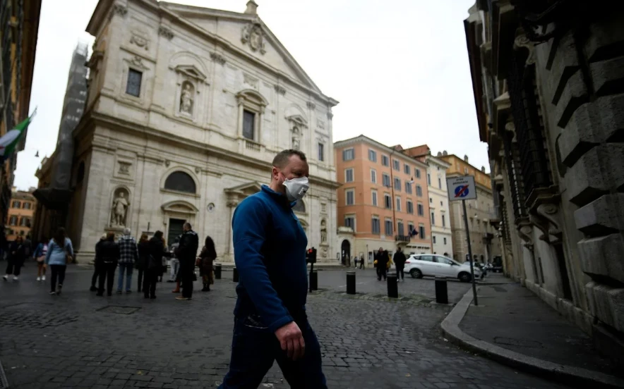 Một người đàn ông đeo khẩu trang đi ngang qua Nhà thờ St Louis ở Rome. Ảnh: AFP