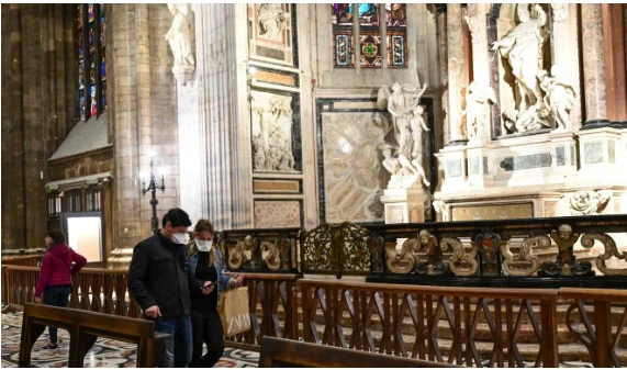 Khách du lịch đeo khẩu trang đến thăm Nhà thờ Milan ở Ý. Ảnh: AFP