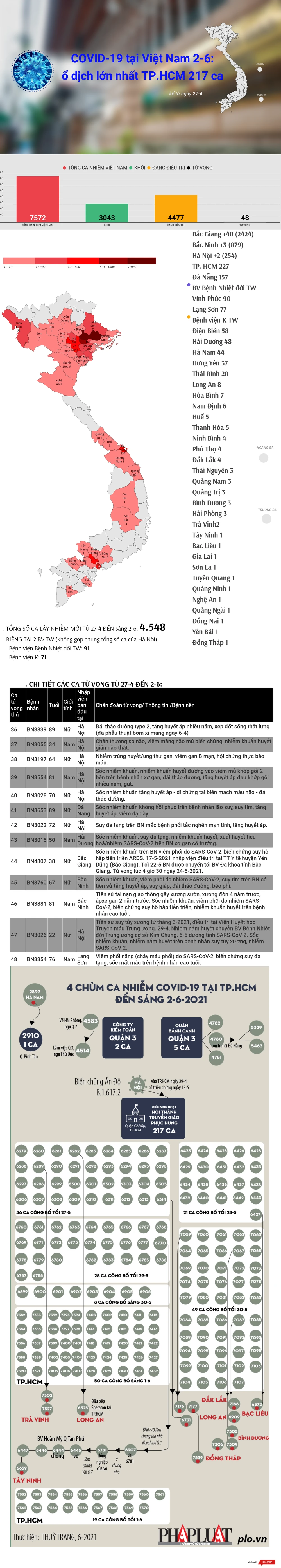 (PLO)- Ổ dịch lớn nhất TPHCM đã lên đến con số 217 ca, tổng số ca cộng đồng hơn 4.500, ca tử vong thứ 48... là những điểm đáng chú ý trong bản tin cập nhật COVID-19 ở Việt Nam ngày 2-6.