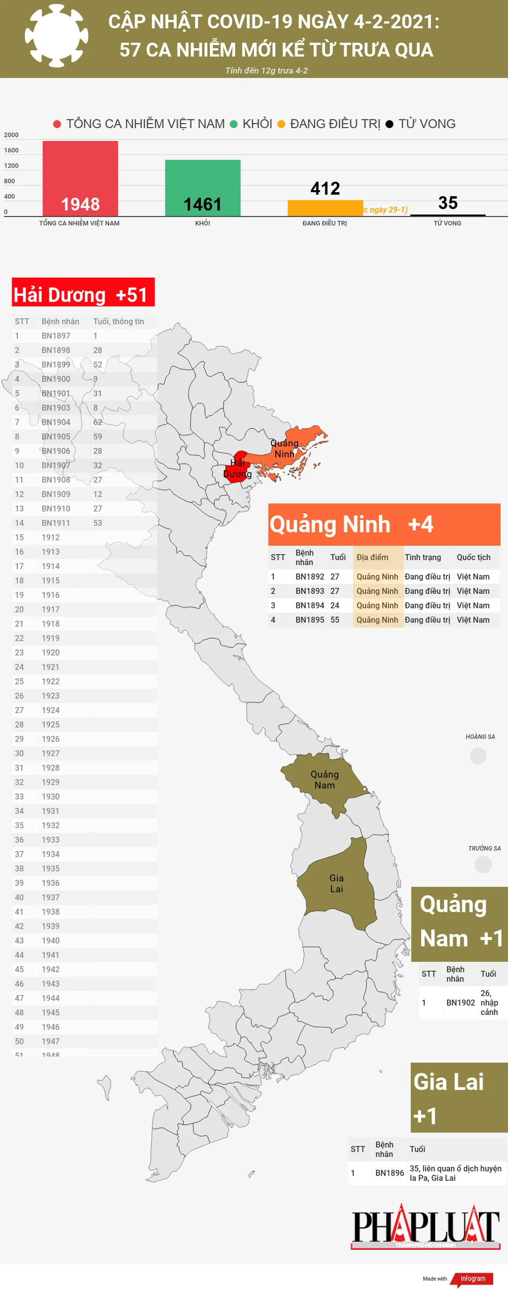 (PLO)- Tính đến 12 giờ trưa 4-2 có 57 ca nhiễm mới được ghi nhận tại bốn tỉnh thành là Hải Dương, Quảng Ninh, Gia Lai, Quảng Nam. Hầu hết các ca nhiễm mới phát hiện đều được cách ly.