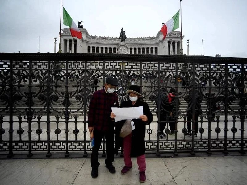 Khách du lịch ở Rome đeo khẩu trang để phòng ngừa dịch COVID-19. Ảnh: NEWS STRAITS TIMES