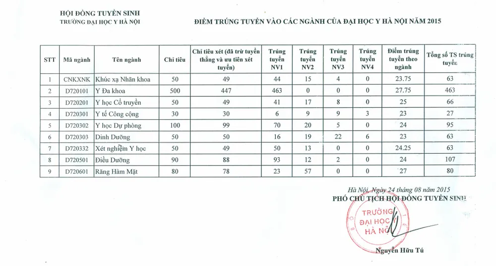 ĐH Y Hà Nội vừa công bố điểm trúng tuyển NV1 vào chín ngành của trường. Theo đó, ngành Y đa khoa có 463 thí sinh trúng tuyển với mức điểm chuẩn 27,75. Ngành Răng Hàm Mặt lấy điểm chuẩn 27 điểm. Các ngành còn lại dao động 23 đến 25 điểm.