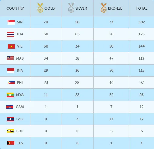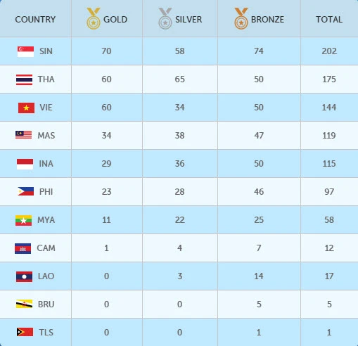 Tính đến 17h30 chiều nay (12-6), với việc giành được 4 HCV ở các môn Taekwondo, bắn súng và điền kinh, đoàn thể thao Việt Nam đã có 61 HCV đứng ở vị trí thứ 3 sau 2 đoàn Thái Lan và chủ nhà Singapore.