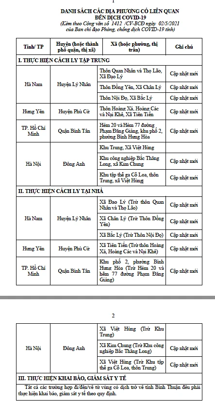 Danh sách người đến Bình Thuận phải cách ly tập trung chiều 2-5 đã thêm các địa phương gồm thôn Đồng Yên, xã Chân Lý; thôn Nội Đọ, xã Bắc Lý đều của huyện Lý Nhân (Hà Nam); thôn Hoàng Các, thôn Nại Khê, xã Tiên Tiến, Phù Cừ (Hưng Yên); hẻm 77, đường Phạm Đăng Giảng, khu phố 2, phường Bình Hưng Hòa, quận Bình Tân (TP.HCM) và Khu công nghiệp Bắc Thăng Long, xã Kim Chung; Khu tập thể ga Cổ Loa, thôn Trung, xã Việt Hùng, Đông Anh (Hà Nội).