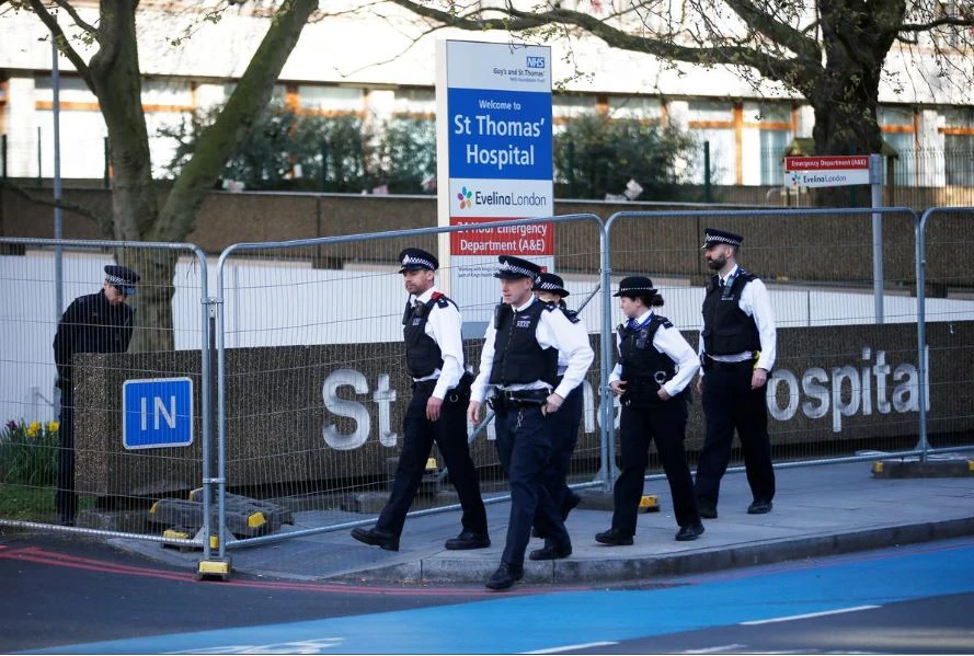 Cảnh sát tuần tra bên ngoài BV St Thomas’ ở London - nơi Thủ tướng Anh Boris Johnson đang điều trị COVID-19 ngày 7-4. Ảnh: REUTERS