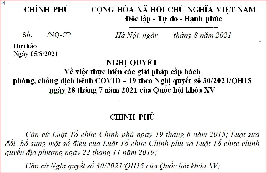 Để triển khai Nghị quyết kỳ họp thứ nhất, Quốc hội khóa XV về các giải pháp cấp bách phòng, chống dịch Covid-19, Chính phủ đã dự thảo một Nghị quyết Chính phủ 15 trang.