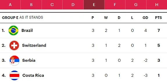Với chiến thắng 2-0 trước Serbia đoàn quân của HLV Tite chiếm ngôi đầu bảng E với 7 điểm, còn Thụy Sĩ với việc để Costa Rica san bằng cách biệt ở những giây cuối cùng với tỉ số 2-2 cũng có cho mình chiếc vé đi tiếp. Đối thủ ở vòng đấu loại trực tiếp của Brazil là Mexico và đối thủ của Thụy Sĩ là Thụy Điển.