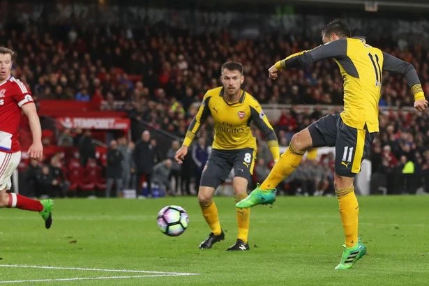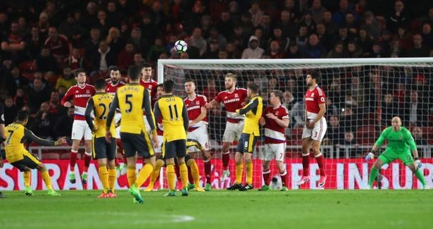 Tưởng như hiệp 1 kết thúc với tỉ số hòa không bàn thắng, nhưng ở phút 42 thì tin vui đã đến với các câu thủ của Arsenal khi họ được hưởng quả đá phạt trực tiếp. Lại một lần nữa Sanchez sắm vai người hùng khi vẽ lên đường cong mỹ mỹ ghi bàn mở tỉ số cho trận đấu.