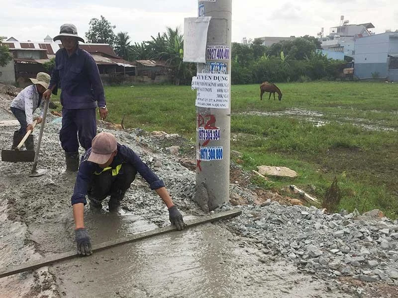 Đường, vỉa hè đang được thi công ở đường Dương Công Khi, xã Xuân Thới Thượng, huyện Hóc Môn, TP.HCM, bên cạnh là đất ruộng đang được rao bán là đất ở. Ảnh: LƯU ĐỨC