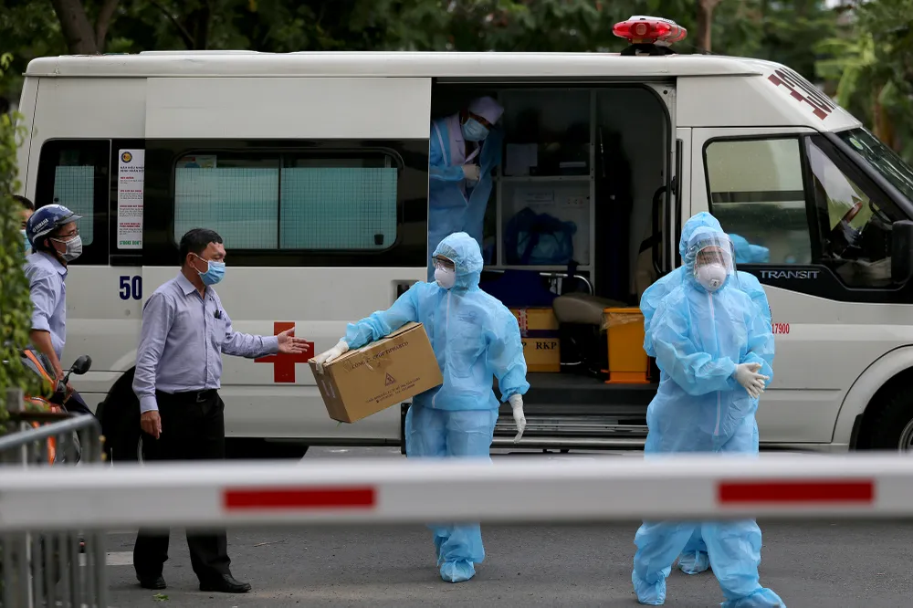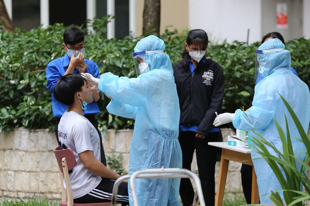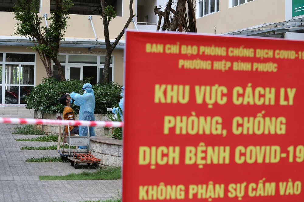 Nhân viên y tế quận Thủ Đức làm việc xuyên trưa để lấy mẫu xét nghiệm cho cư dân tại chung cư.