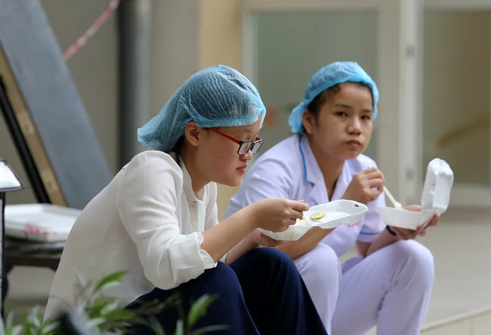 Hai nhân viên y tế thủ tranh thủ ăn trưa khi đồng hồ đã điểm 2 giờ chiều.
