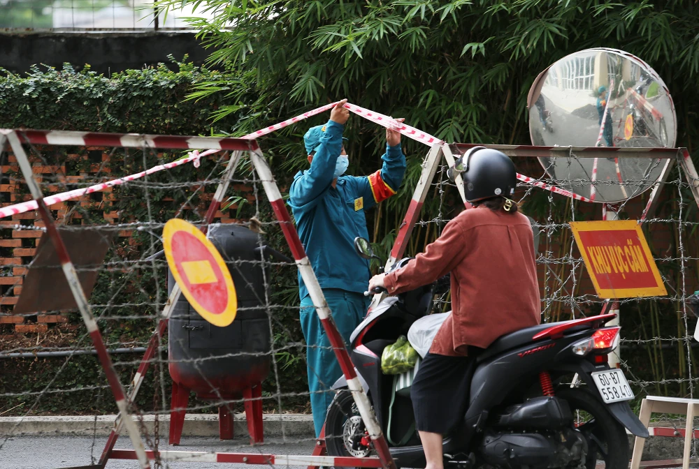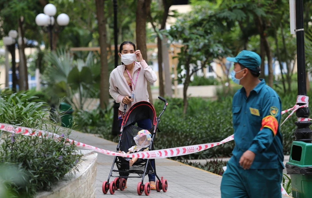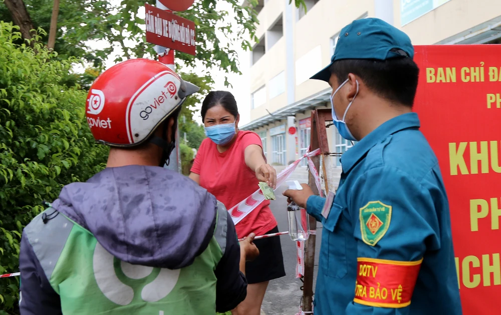 Người dân trong khu chung cư không được ra ngoài. Các vật dụng thiết yếu được lực lượng chức năng tiếp nhận ở cổng và chuyển vào trong cho cư dân.