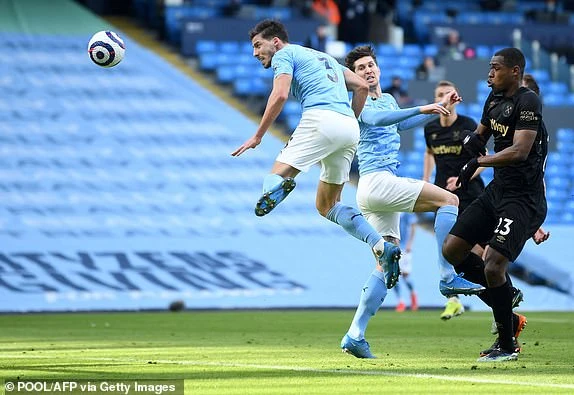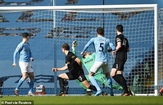 Đá trên sân nhà với dàn cầu thủ chất lượng hơn đối thủ, Man. City cầm bóng đến 64% trong hiệp một, nhưng West Ham lại là đội có được nhiều cú sút hơn với 5 pha dứt điểm. Tuy West Ham tự tin thi đấu, nhưng đến phút 30 lưới của thủ môn Darren cũng phải rung lên. Tiền vệ Kevin De Bruyne có đường tạt bóng chính xác cho trung vệ Ruben Dias đánh đầu cận thành mở tỷ số 1-0 cho “man xanh”.