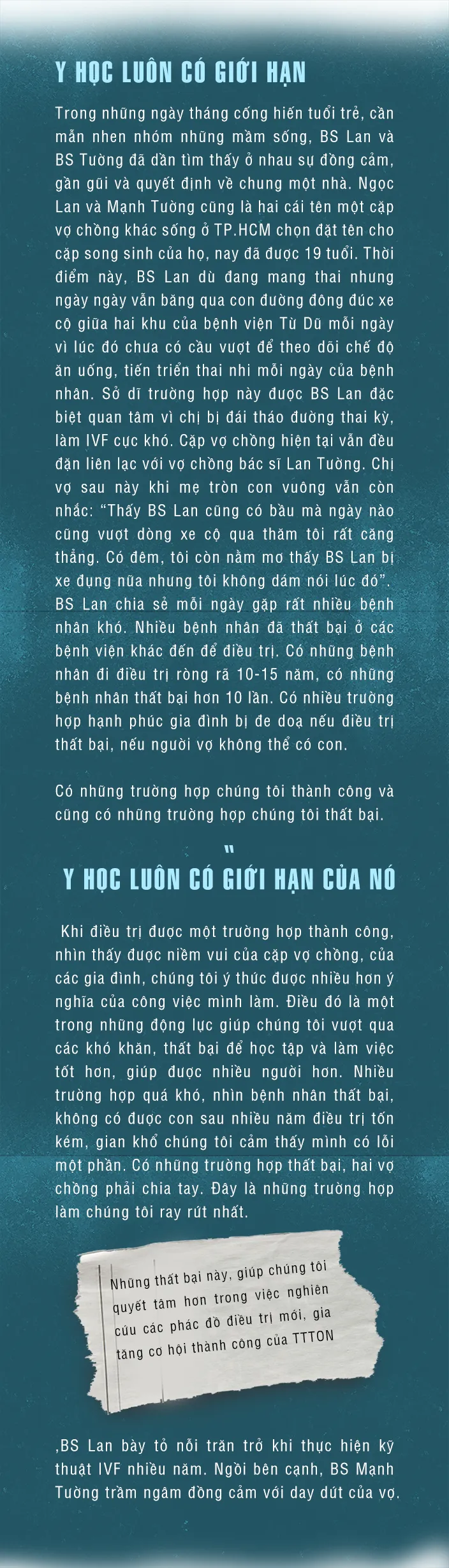Đến bây giờ, BS Lan và BS Tường có thể kể từng hoàn cảnh cặp vợ chồng trong đợt đầu được chọn làm kỹ thuật IVF tại bệnh viện. Lo ngại làm IVF không thành công, nhiều cặp vợ chồng đã thuê phòng ở hẳn bệnh viện, không dám về cho đến ngày lâm bồn. Thời điểm này, BS Lan và BS Tường chưa lập gia đình nên hầu như thời gian ở bệnh viện là chủ yếu, kể cả ngày thứ bảy, chủ nhật.