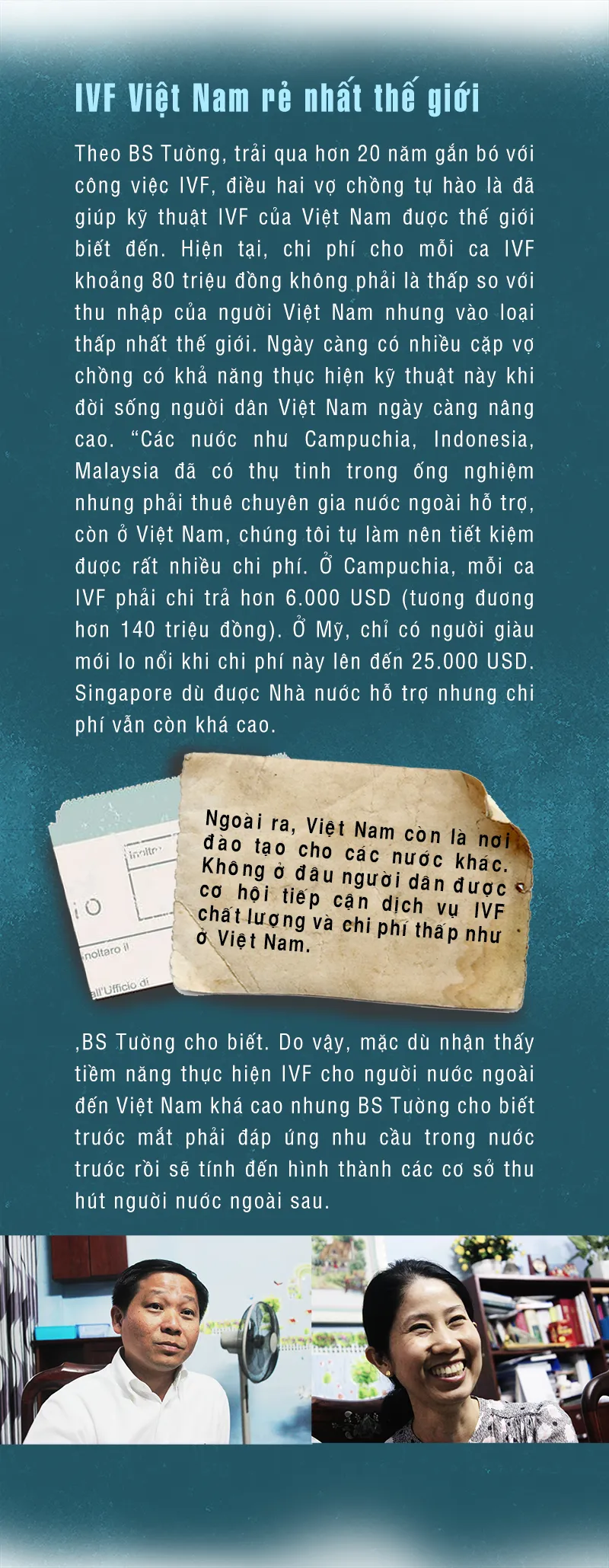 May mắn chúng tôi cũng sắp xếp được một buổi hẹn mà hai vợ chồng cùng có mặt ở nhà vào chiều muộn tại căn nhà nhỏ ba thế hệ chung sống ở đường Trần Đình Xu (quận 1). Ấn tượng của chúng tôi là hai vợ chồng khá lịch sự, khiêm tốn. Khi ngồi cùng nhau, bác sĩ Lan khá sôi nổi còn bác sĩ Tường điềm tĩnh, ít nói hơn. Tuy nhiên, ánh mắt của hai người đều rạng ngời, đầy hứng khởi khi nhắc đến những ngày đầu chập chững bắt tay vào công việc rất mới ở thời điểm cả nước chưa từng có em bé thụ tinh trong ống nghiệm (IVF) nào ra đời. Có lẽ cả hai cũng không ngờ đó là cái nghiệp cả hai sẽ theo đuổi suốt đời mình.