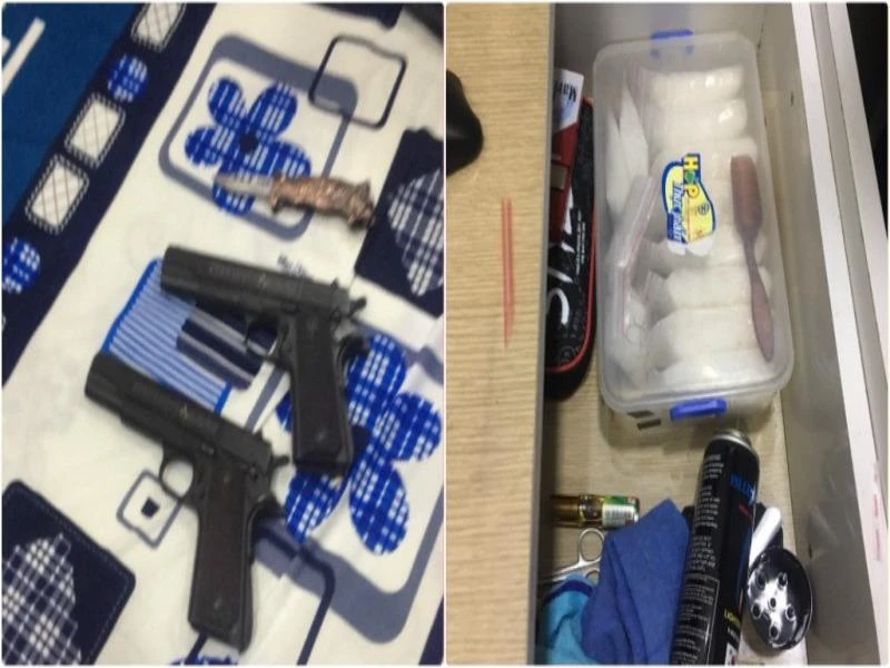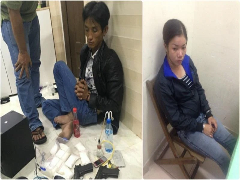 Tiến hành khám xét khẩn cấp hai nơi ở của vợ chồng này, Đội Cảnh sát hình sự đặc nhiệm hướng Nam và Công an huyện Nhà Bè phát hiện nơi này có hai khẩu súng ngắn, hơn 1,3 kg ma túy đá, hộp tiếp đạn, lưỡi lê, đao…