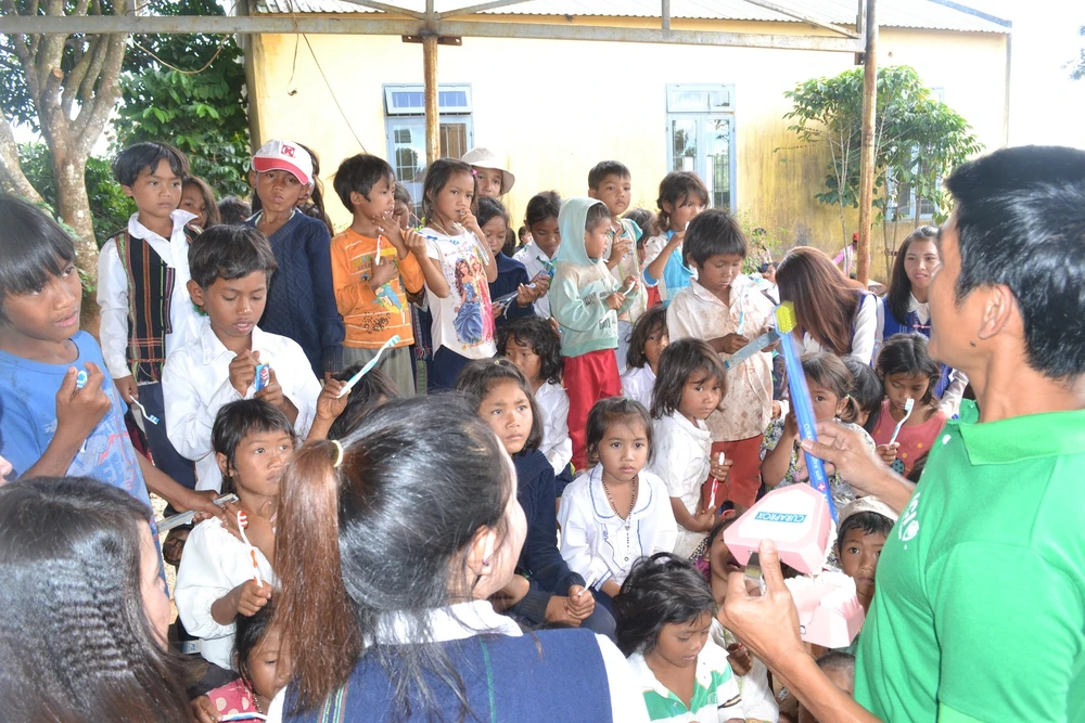 Không chỉ tặng quà cho bà con, một thành viên của diễn đàn, anh Lê Hồng Anh (nha sĩ) luôn thực hiện sứ mệnh ''Răng thật là răng tốt nhất'' còn tặng bàn chải đánh răng và hướng dẫn các cháu chải răng đúng cách.