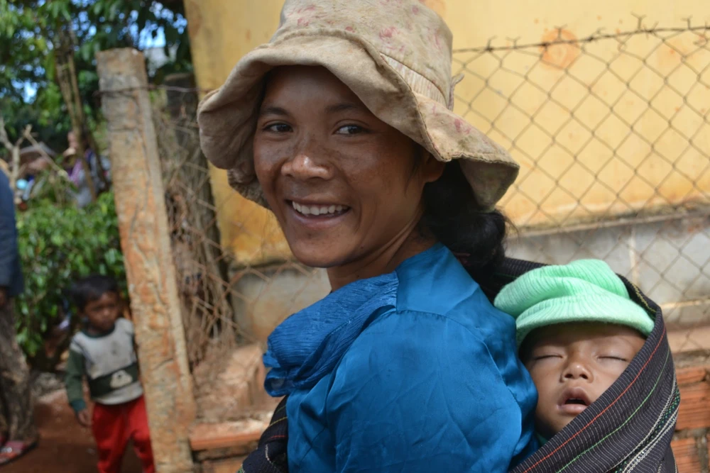 Chị K'Luon địu bé con đang ngủ ngon lành cho biết chị có ba con, bé nhỏ nhất được hai tháng tuổi. Chồng chị đã đi rẫy còn chị ở nhà lo việc nhà, chăm con. Khi được nghe mình có tên trong danh sách nhận quà, chị vui lắm, sáng sớm đã cùng bà con trong thôn ra đón đoàn.