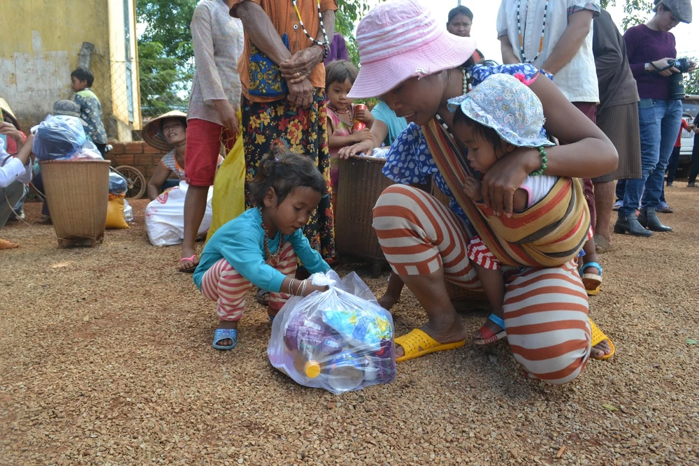 Buôn Chuối hiện có hơn 160 hộ dân, trong đó gần 80% dân số là người K’Ho, đời sống còn nhiều khó khăn, vất vả. Nghe có đoàn từ thiện về, từ sớm chị em phụ nữ đã vai gùi, tay dắt con đến điểm sinh hoạt cộng đồng của thôn chờ đoàn.