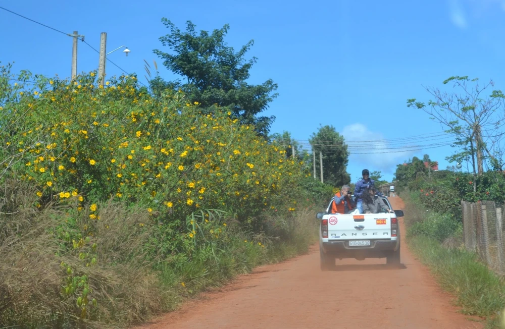 Đường vào thôn Buôn Chuối còn là đường đất đỏ, bụi tung mù trời, nhiều đoạn còn đầy ổ voi to tướng nhưng không vì thế mà làm chùn bước chân của mọi người. Hai bên đường rực rỡ màu vàng của hoa dã quỳ, màu đỏ của hoa trạng nguyên, rồi cây cà ri, cà phê, chanh dây đủ loại khiến cảnh trở nên lung linh hơn trong nắng sớm.
