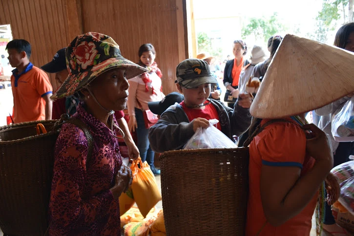 Các thành viên nhí cũng theo chân ba mẹ tham gia tặng quà cho bà con
