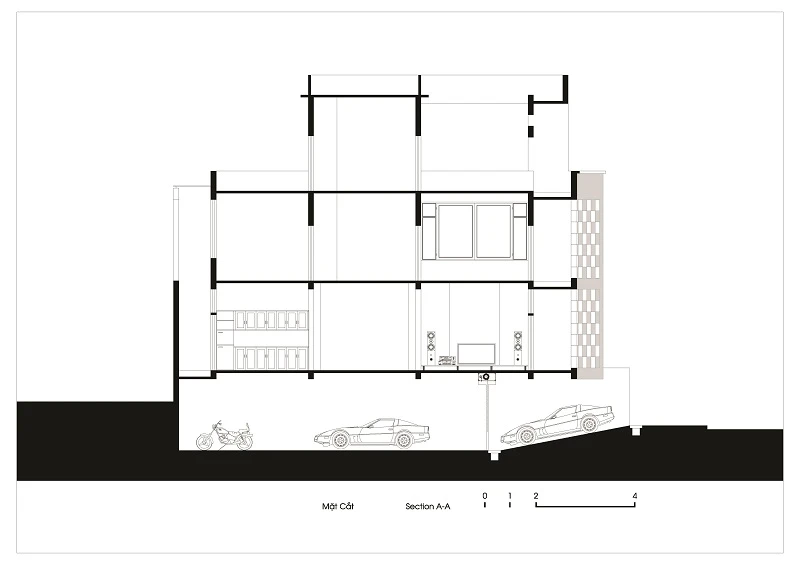 KTS và chủ nhà lên ý tưởng thiết kế một tòa nhà với tầng hầm dành cho bãi đỗ xe hoặc nhà kho mà không ảnh hưởng đến diện tích còn lại để sinh sống.