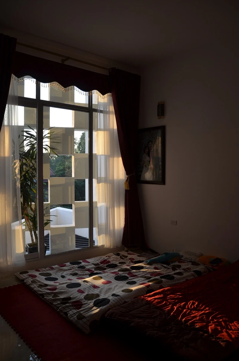 Phòng ngủ cũng trở nên thơ mộng hơn với ánh hoàng hôn chiếu qua từng ô caro nhỏ.
