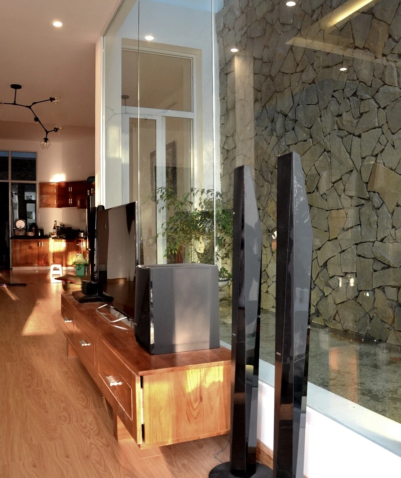 Chủ nhà muốn cảm nhận sự khác biệt và muốn có âm thanh của nước bên trong ngôi nhà. KTS Nguyễn Hiếu đã nghiên cứu và chọn nhiều điểm nhấn tạo sự khác biệt trong phòng khách. Đó là thác nước chảy trên bề mặt đá tự nhiên. Qua bàn tay biến hóa của KTS bây giờ phòng khách không còn để xem TV mà để thư giãn; thưởng thức một tách trà trong khi ngắm hoàng hôn lắng nghe âm thanh róc rách từ thác nước.
