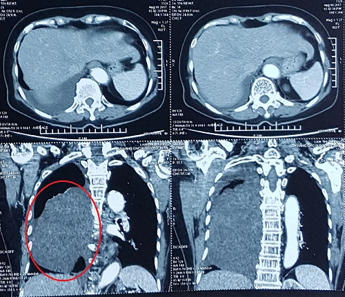 Trước đó, sau một thời gian dài xuất hiện triệu chứng khó thở, tức ngực, bà Lâm Thị T. (74 tuổi) đến khám tại BV Ung bướu Đà Nẵng. Tại đây, các bác sĩ phát hiện trong người bệnh nhân có một khối u lớn ở trung thất, chèn vào phổi làm tắc đường hô hấp, chèn lệch tim…