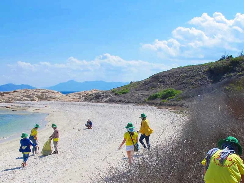 Các tình nguyện viên đang dọn rác, làm sạch môi trường trên Khu bảo tồn Hòn Cau. Ảnh: PHƯƠNG NAM