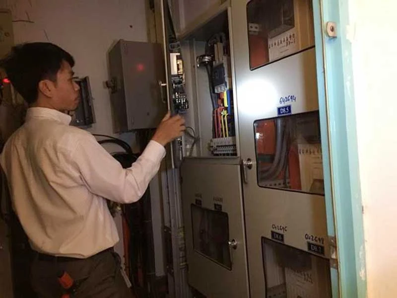 Nhân viên ban quản lý chung cư 584 đang cúp cầu dao điện căn hộ nợ phí trên ba tháng. Ảnh: Đ.NHƯ