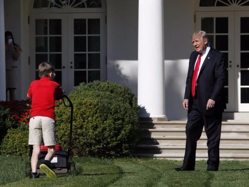 Cậu bé mải cắt cỏ mà không nhìn thấy sự hiện diện của vị Tổng thống. Ảnh: Getty