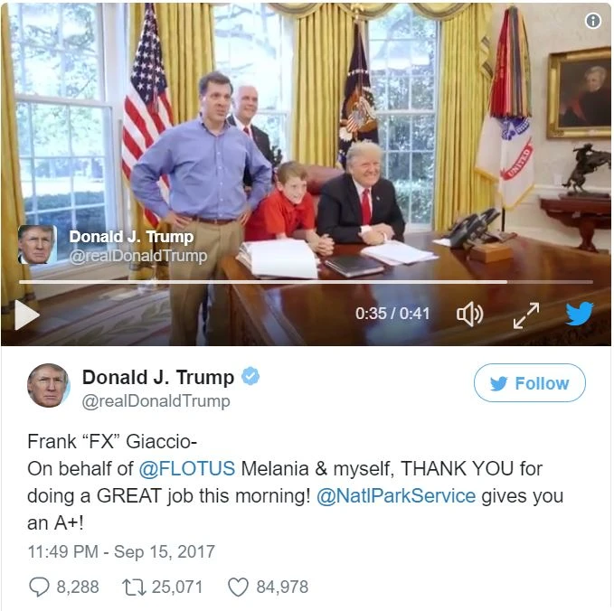 Tổng thống Mỹ sau đó mời hai cha con Fank thăm phòng Bầu dục và ông Trump thậm chí còn trực tiếp đăng lời cảm ơn trên trang Twitter và cho cậu điểm A+ vì tinh thần lao động của cậu bé.