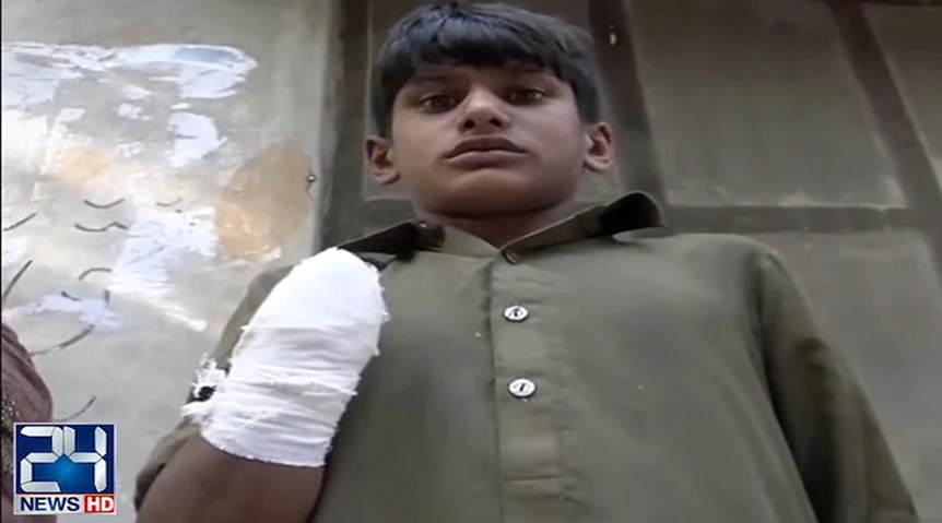 Cậu bé 13 tuổi ở Pakistan bị bà chủ chặt tay vì đòi tiền lương. Ảnh: 24 News HD