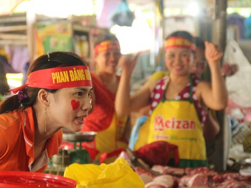 Tiểu thương tại chợ Hải Lăng đeo băng rôn cổ vũ cho Nhật Minh. Ảnh: NGUYỄN DO