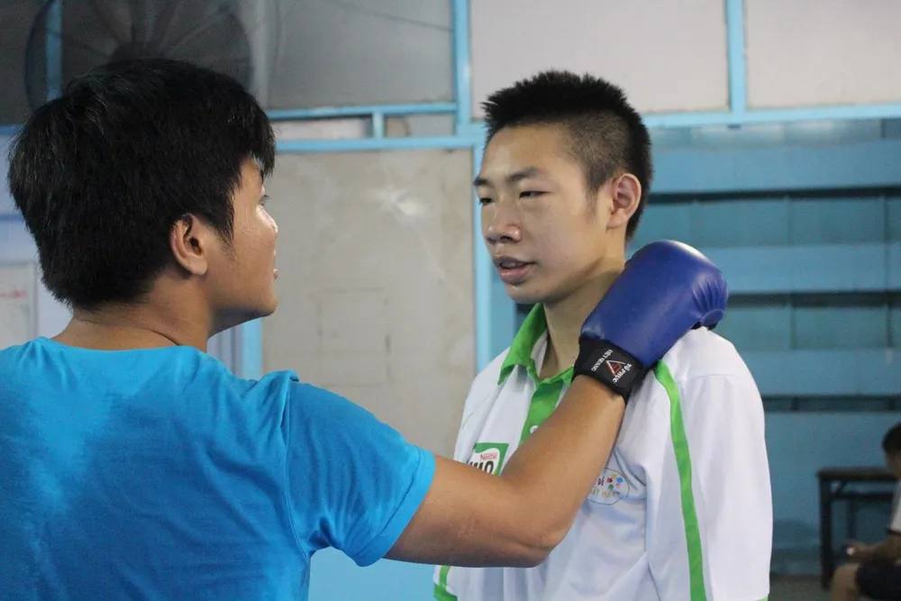 Nguyên (phải) tại lớp võ hiện nay. Ảnh: MT