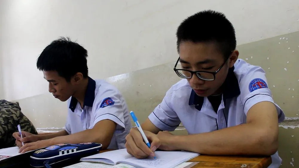 Nguyễn Trung Nguyên (phải) đã đi học trở lại. Ảnh: MT