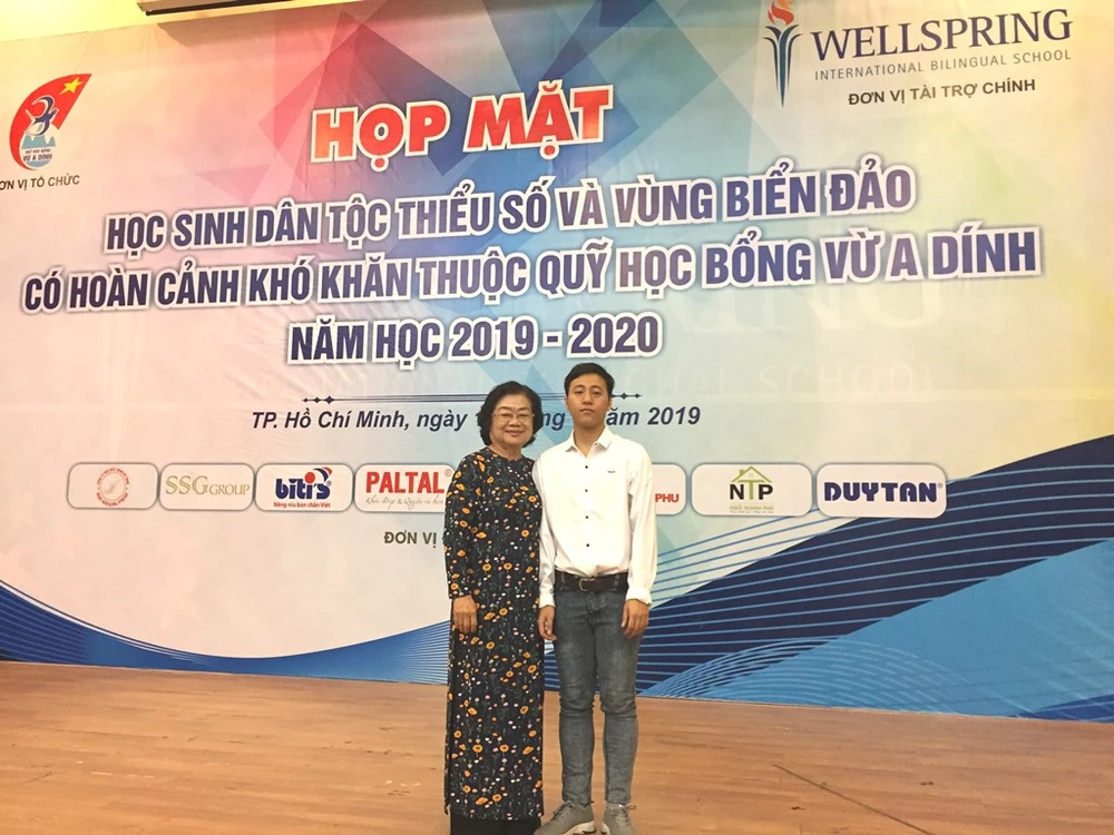 Thào A Khay ngày nào đã trưởng thành, vào đại học và bà Trương Mỹ Hoa, Nguyên Phó Chủ tịch nước, Chủ tịch Quỹ học bổng Vừ A Dính. Ảnh: HL