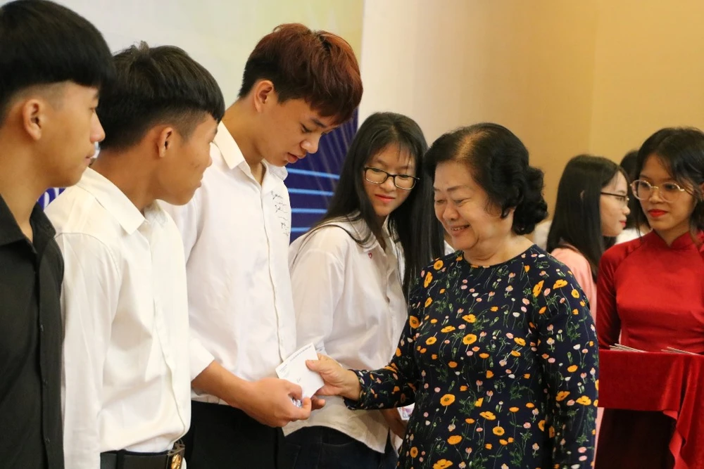 Bà Trương Mỹ Hoa, Nguyên Phó Chủ tịch nước, Chủ tịch Quỹ học bổng Vừ A Dính, chúc mừng các em tân sinh viên của dự án "Ươm mầm tương lai". Ảnh: HL