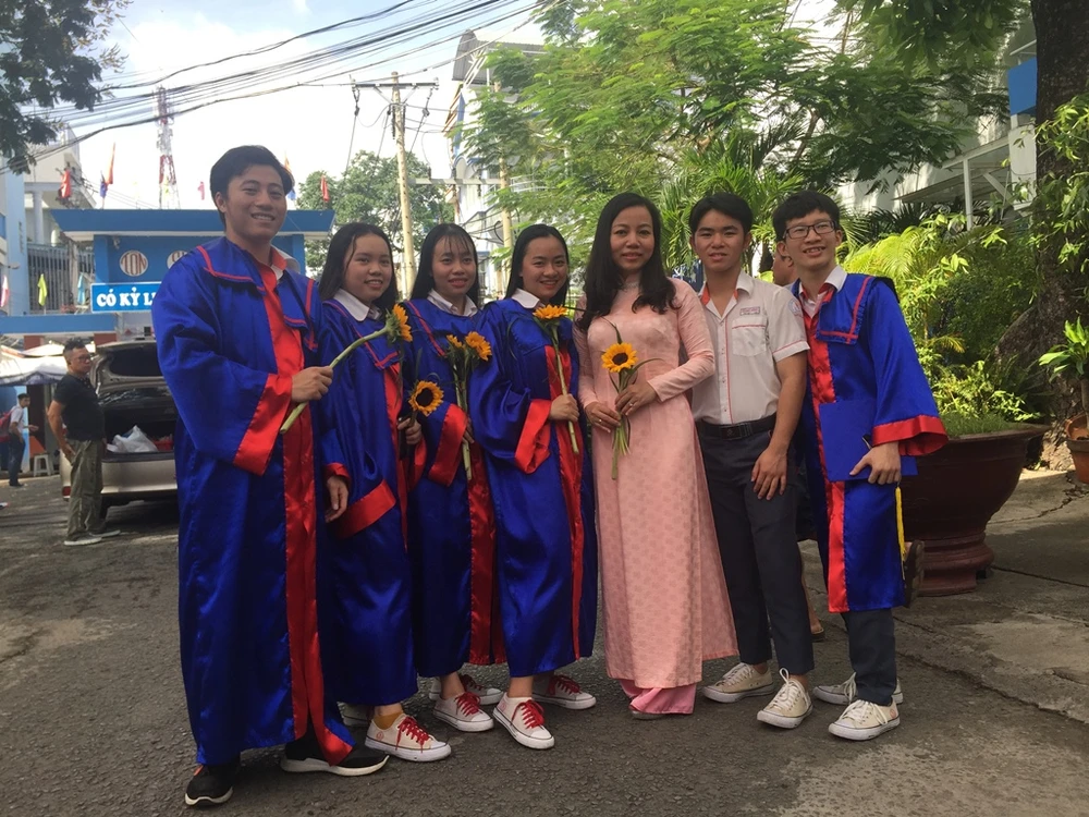 Thào A Khay (ngoài cùng, bên trái) vào ngày tốt nghiệp cấp 3 bên bạn bè và thầy cô. Ảnh: A Khay