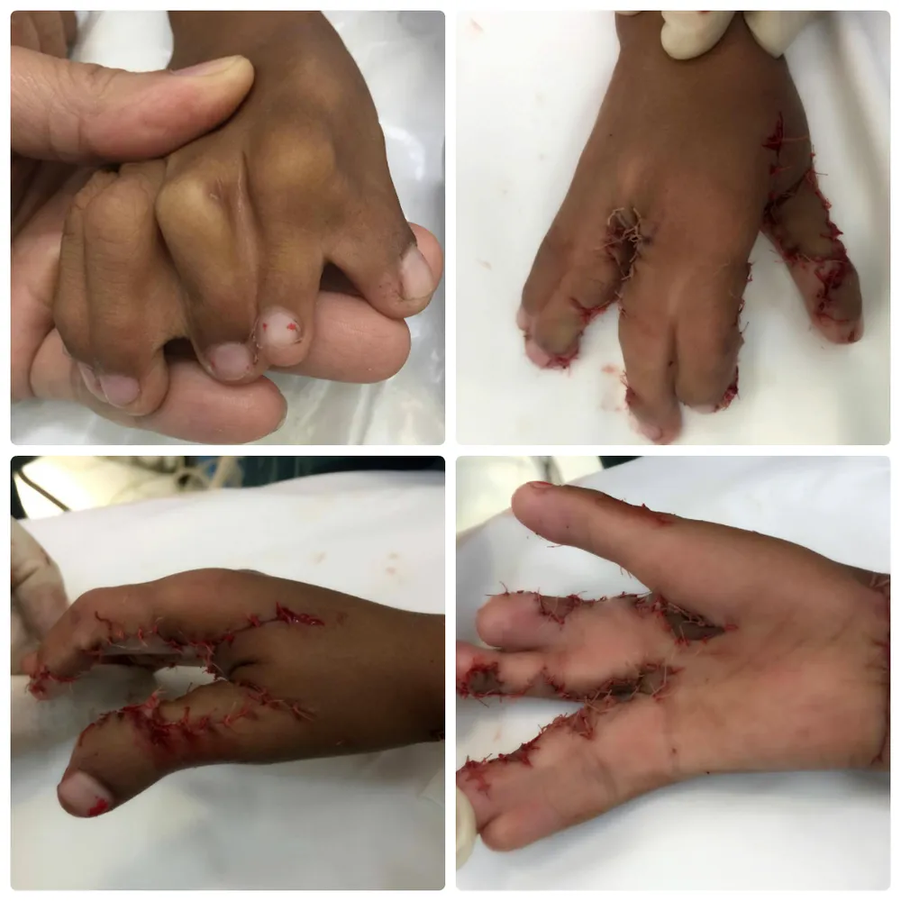 Ảnh trước và sau phẫu thuật tạo hình bàn tay phải cho bé Lâm. Ảnh: BS