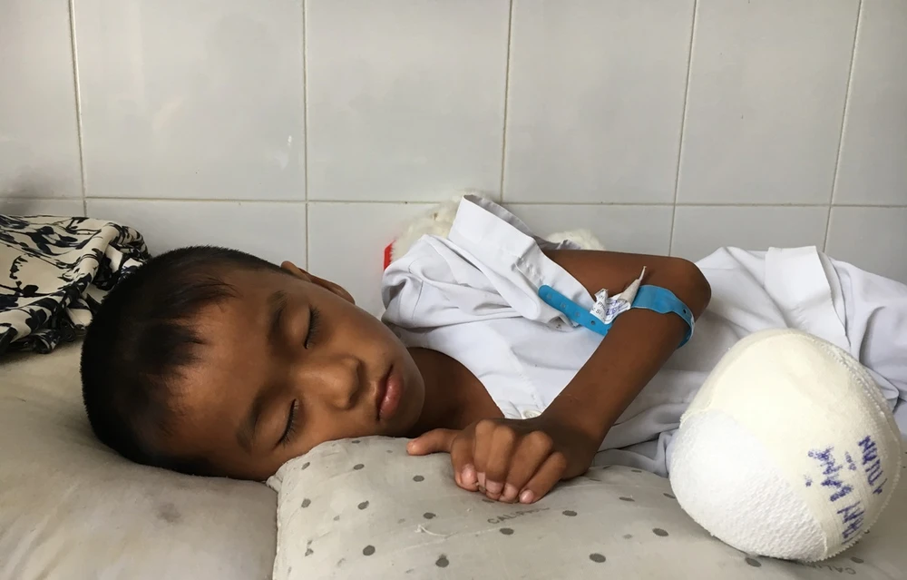 Ngày 23-11, sau hai ngày được phẫu thuật tạo hình cho bàn tay phải bị dị tật dính ngón, bé Thông Thái Lâm (bảy tuổi) vẫn còn đau bởi vết mổ.